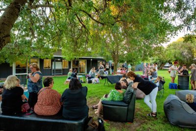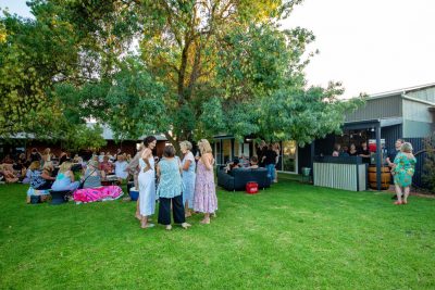 With all guests arriving for an evening “street food” finger food dinner, provided by Tulsi and the team from Riverina Food Truck, many pre-laugh laughs were had among friends and new friends in our grassed courtyard.