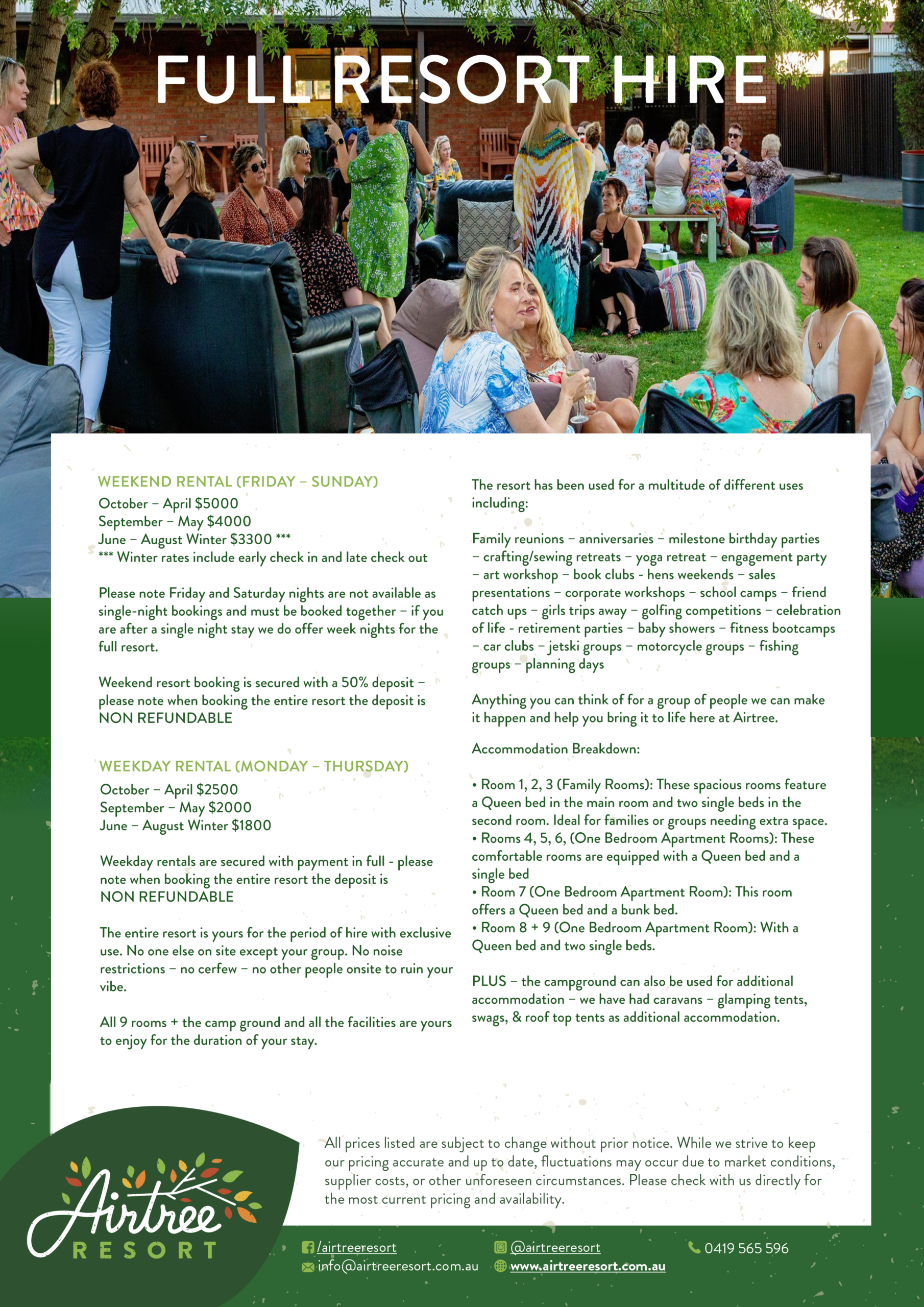 Please find a link to our pricing detail below – please by all means contact us at any stage with questions and we hope to see you at the resort soon.